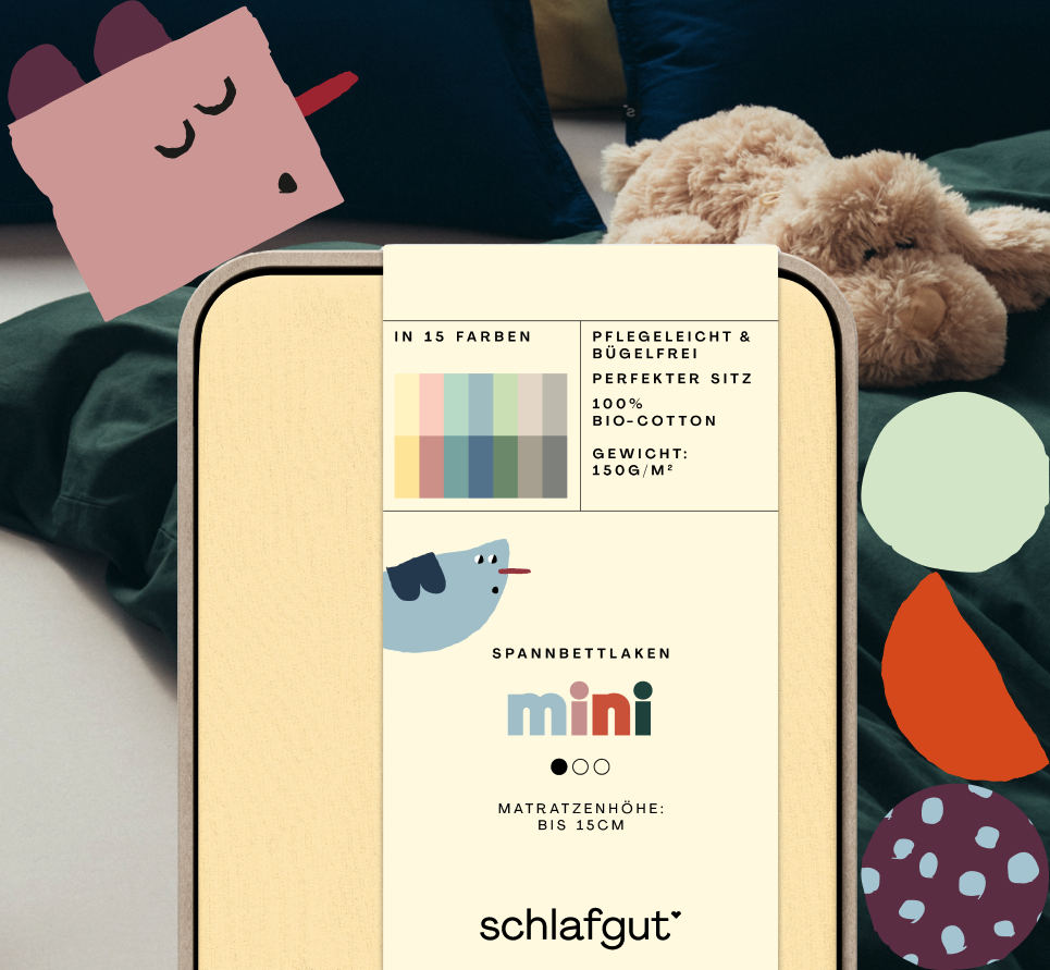 schlafgut Spannbettlaken Mini eignen sich für Kindermatratzen bis zu einer Höhe von 15cm. Der original Flexfit Rundumgummi macht unsere Spannbettlaken Mini sehr stabil und verhindert z.B. das Verrutschen des Spannbett-lakens auf der Matratze.